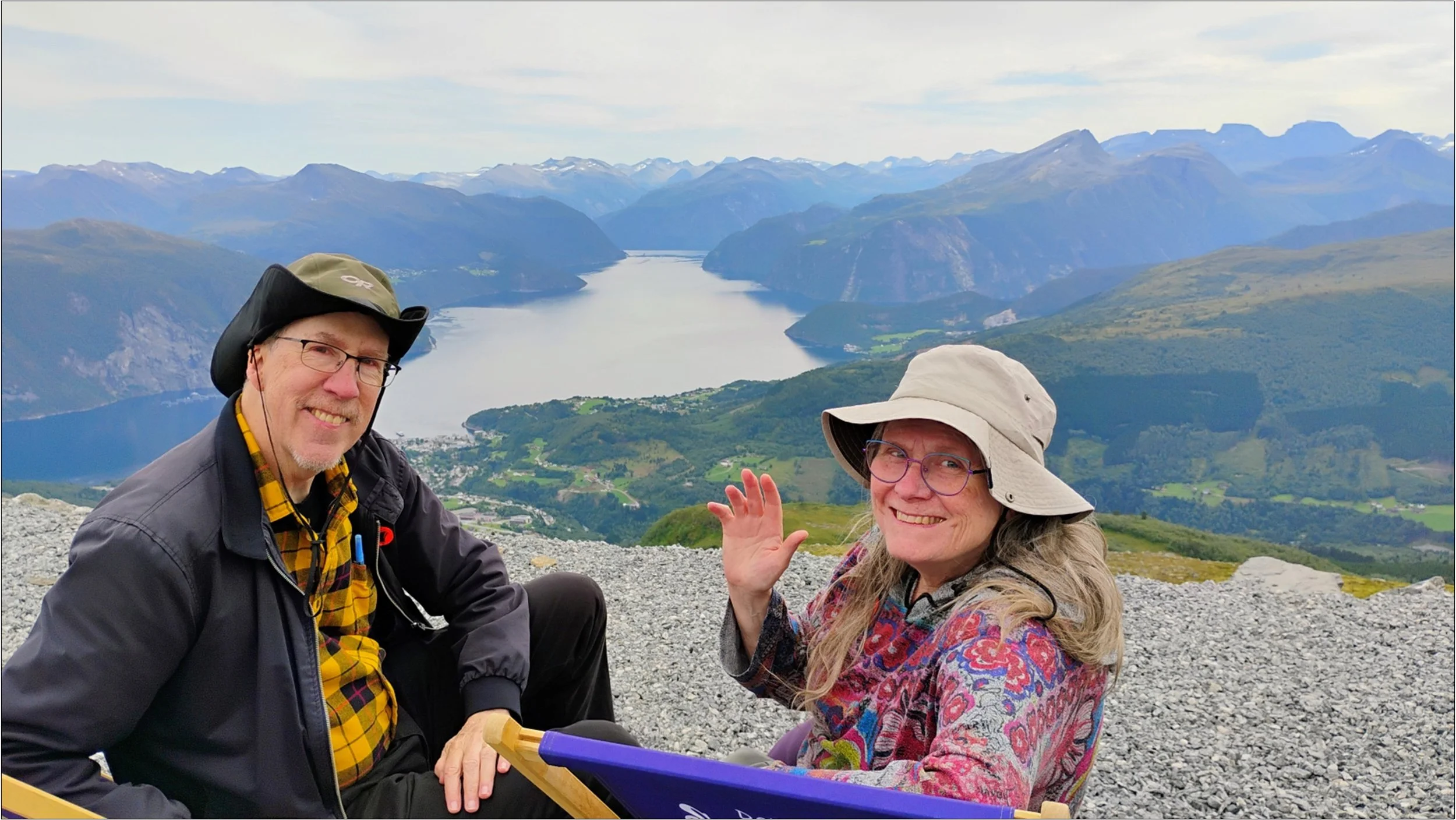 One such “Wow” moment: We were taken up a mountain in a skyride cable car. This was some miles (and two ferry rides) outside of Ålesund, Norway. The views were breathtaking on the way up, but when we got out at the top, we were blown away. We were literally and spiritually sky-high. We knew photos would not do justice to the view, but we took them anyway. Down in the bottom of the valley, a village sat, looking toy-like, so small and yet real, with tiny vehicles moving on tiny roads. Cloud shadows contrasted with the sunlit places around the valley. It was a true “Wow” moment.